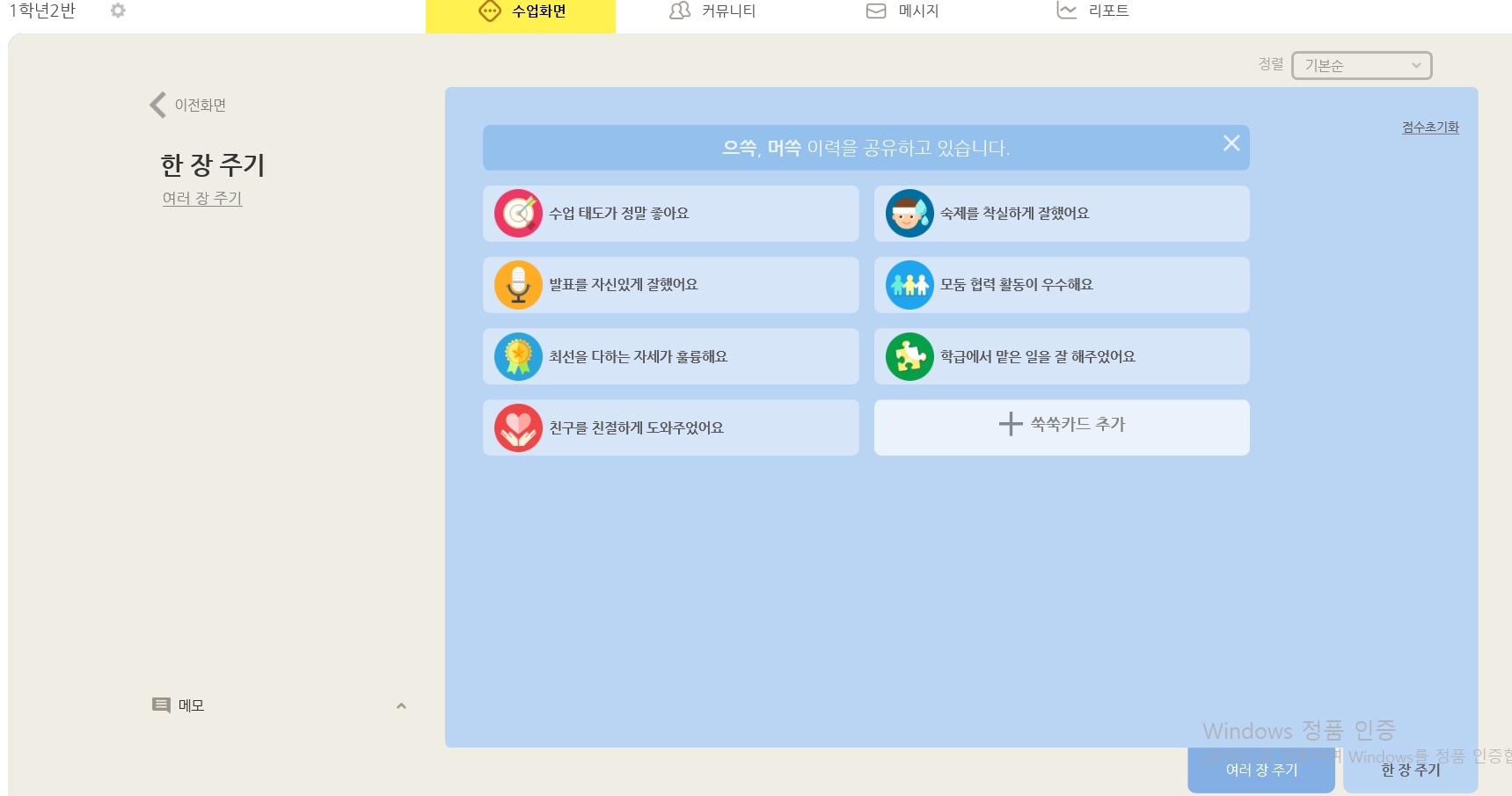 점수를 주는 적절한 이유를 선택합니다. 여러장을 주고 싶으면 여러 장 주기를 클릭하시면 됩니다.